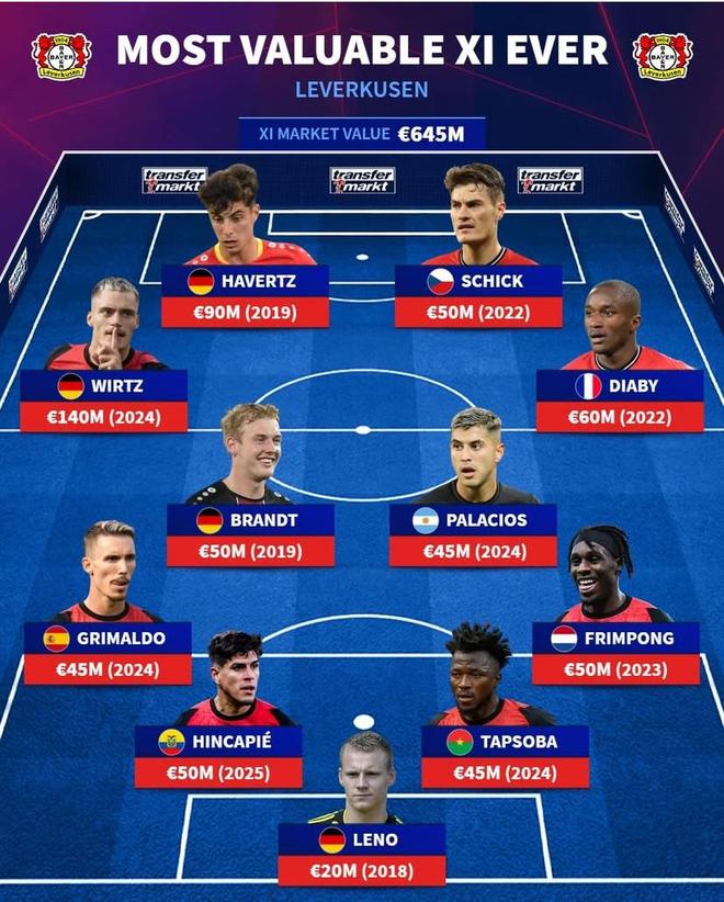 德转列勒沃库森历史最贵11人阵容: